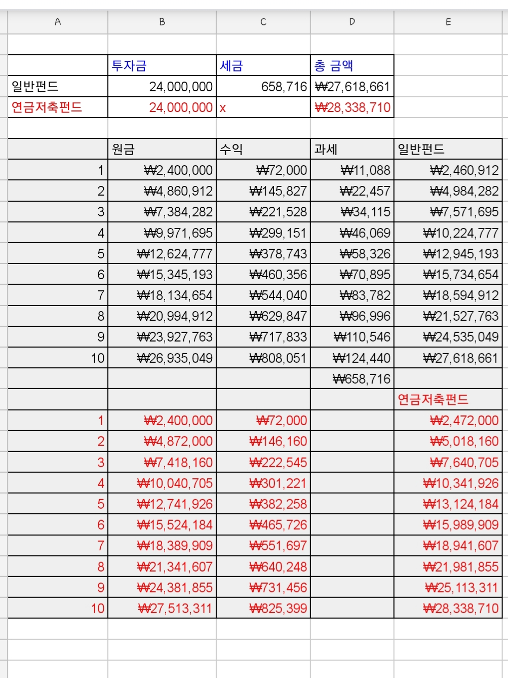 연납입금 240만원,수익률 3%, 10년을 납입한다고 가정했을때 일반펀드와 연금저축펀드의 총액을 비교해보겠습니다.